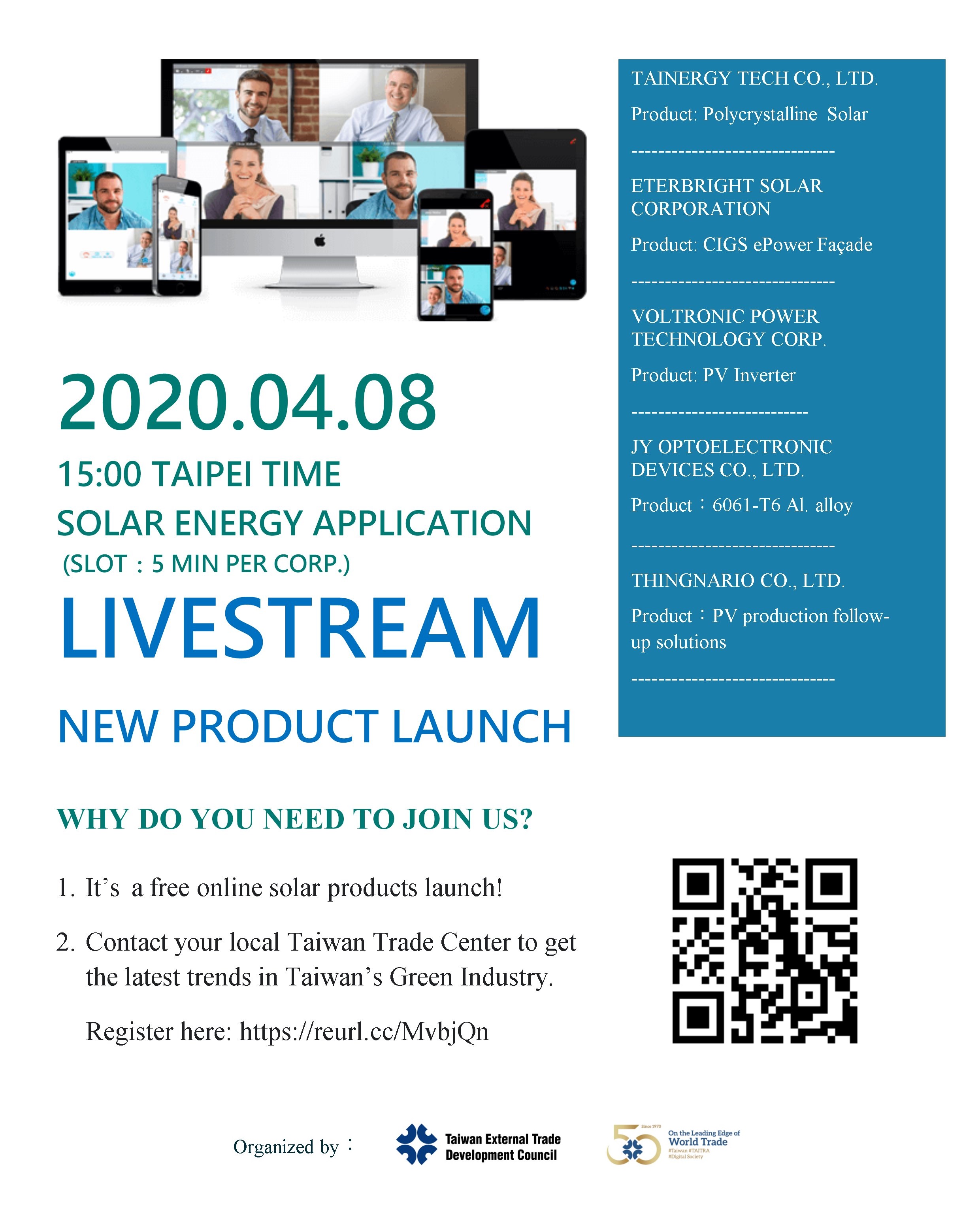 Presenters include Taiwan well-renowned solar companies: Tainergy, Eterbright Solar Corp., Voltronic, JY Optoelectronic Devices & Thingnario Ltd.