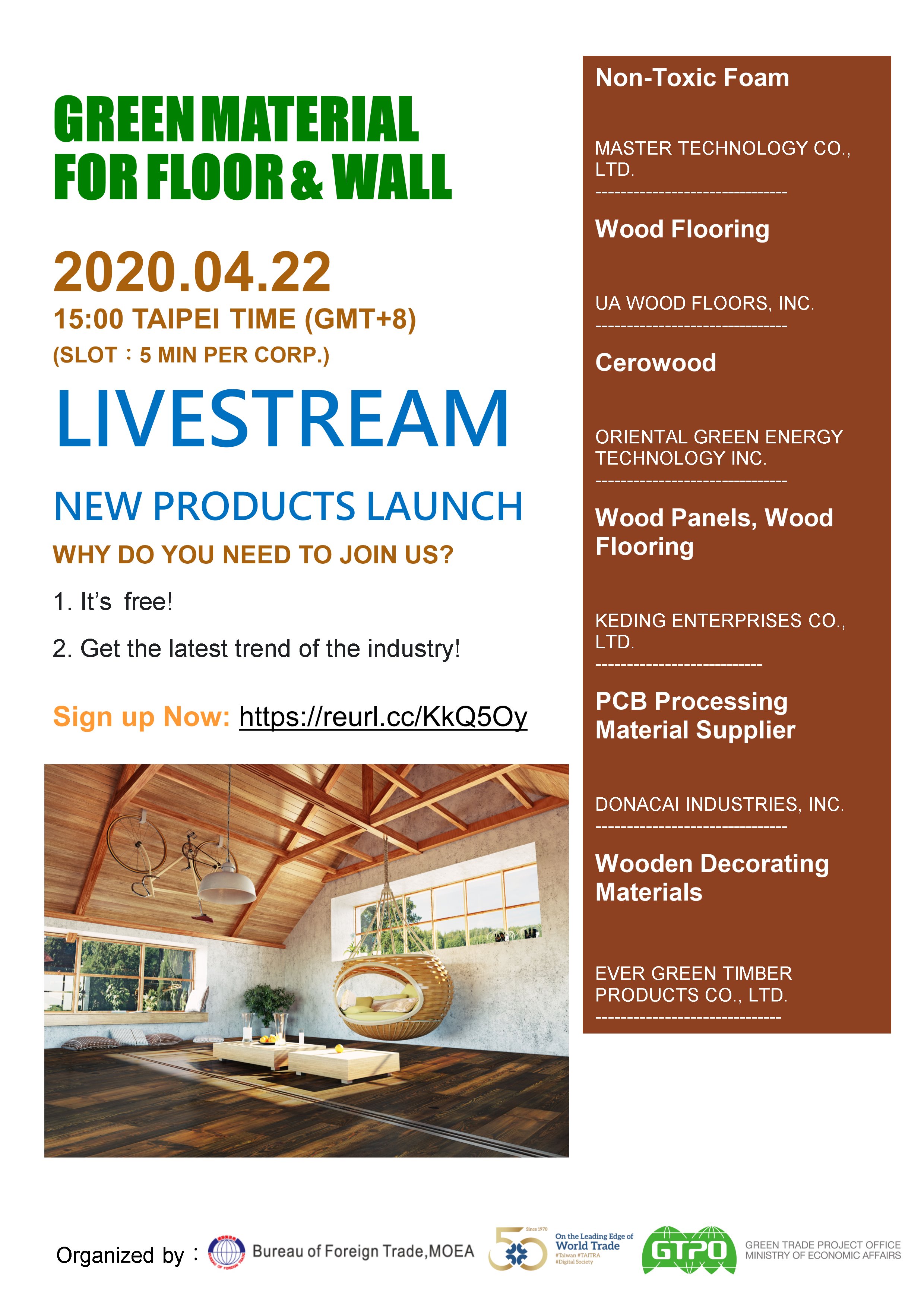 Presenters include Taiwan well-renowned green material companies: MEGA MASTER TECHNOLOGY, UA WOOD FLOORS, ORIENTAL GREEN ENERGY TECHNOLOGY, KEDING ENTERPRISES, DONACAI INDUSTRIES, EVER GREEN TIMBER PRODUCTS.