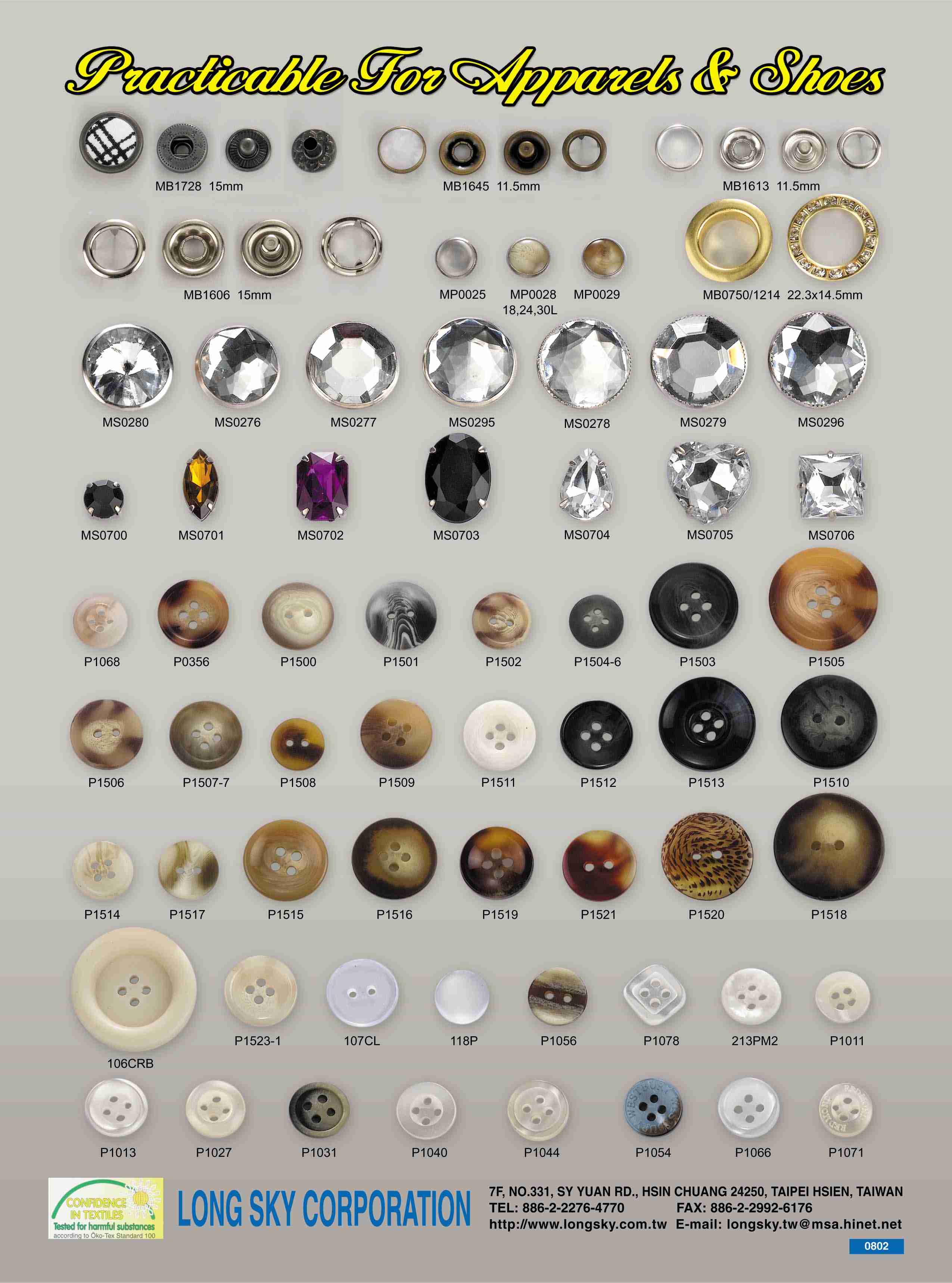 1. Material: polyester button ( resin button), nylon button, acrylic button, ABS button, metal button, rhinestone button, metal buckle, nylon buckle, acrylic buckle, ABS buckle, rhinestone buckle, plastic tube for button, metal accessories, bra accessories, garment accessories etc. 2. Usage: for shirt, uniform, suit, slipover, pullover, knit top, sweater, woolen sweater, cardigan, blouse, skirt, pants, jeans, trouser, shorts, dress, jacket, coat, overcoat, cloak, robe, maternity clothes, pajamas, underwear, sleepwear and other garments, gloves, mitten, hat, scarf, muffler, neckerchief, shoes, boots, bag, etc. 3. Sizes: 12L~100L 4. Color: Different colors and effects available 5. Quality: Oeko-Tex Standard 100 certificate for polyester resin button 6. Minimum quantity: Different minimum q'ty for different sizes and items 7. Your design and logo are welcome (ODM and OEM Accepted) 8. Contact us to get more different designs 9. See more on www.longsky.com.tw